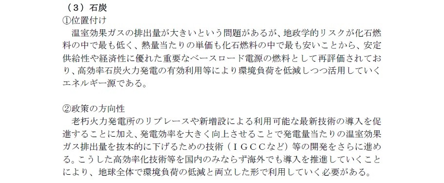 石炭が他のエネルギー資源と比べてどのような優劣であるかは、まさに「温室効果ガスの排出量が大きいという問題があるが、地政学的リスクが化石燃料の中で最も低く、熱量当たりの単価も化石燃料の中で最も安いこと」である(資料1)。
