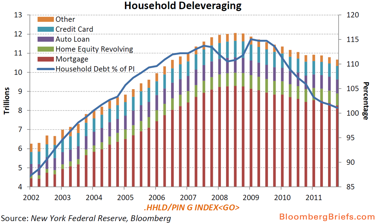 アメリカの失業率はゆるやかに回復してきたとはいえ、未だに8.2%である。株価の回復ほどには、アメリカ人の生活実感は全く回復していないのである。GoogleやAppleなど、アメリカのグローバル企業は確かに強いが、アメリカの庶民の生活はそれほど潤ってはいない。そういった不満は最近のウォール街を占拠せよ(Occupy Wall Street)デモで端的に現れている。今後もアメリカ人の生活はしばらくガマンが続くだろう。なぜならば、まだアメリカ人は借金漬けで、その返済にしばらくは追われるだろうからだ。