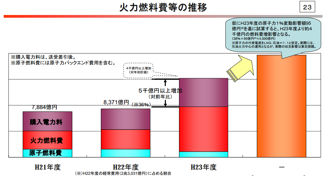 上の図は関電の資料だが、昨年の火力燃料費は2010年より5000億円以上増え、今年はさらに4000億円増える見通しだ。9000億円もコストが増えるのに、値上げしなかったら関電の経営は破綻するだろう。今年の燃料費は2010年の2倍以上になるので、電気代が5割ぐらい上がっても不思議ではない。総括原価主義では、コストはすべて電気代に転嫁できるからだ。