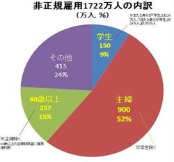 そして「終身雇用」のもとでは、総合職の女性も、いったん辞めたあと再就職するときは、パートタイマーしかない。よく「若者の雇用が不安定でかわいそうだ」というが、実は非正社員の半分以上は図のように主婦のパートであり、問題は世代間格差だけではなく性間格差なのだ。