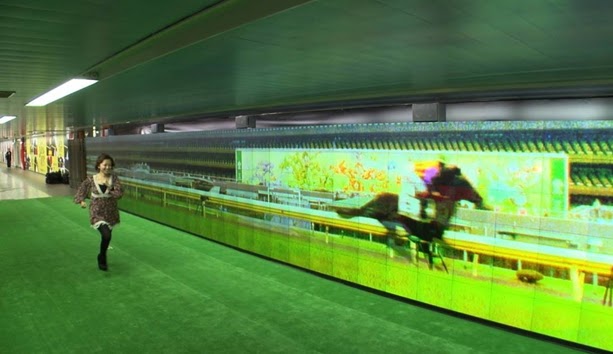 — 等身大の競走馬が新宿の地下を走る。いっしょに走ってみる。非日常を日常空間に持ち込む。サイネージの進化を間近に感じさせます。