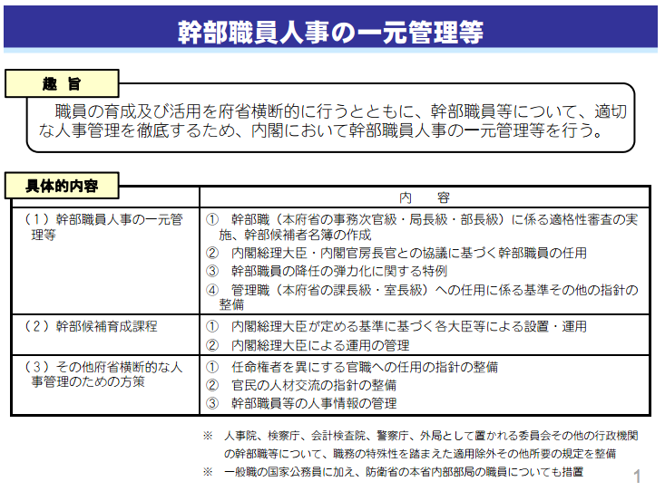資料1の「幹部職(本府省の事務次官級・局長級・部長級)に係る適格性審査の実施、幹部候補者名簿の作成」については、事務次官級・局長級が200人、部長級が400人なので、総計600人規模の幹部人事となる。これは虚妄だ。600人もの適材適所をどうやって行うというのか。この数字が現実的なものであれば、かなりの毒にもかなりの薬にもなろうというものだが、600人は多過ぎる。だから、毒にも薬にもなり得ないと思う。