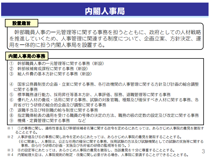 資料3〔=内閣人事局〕と資料4〔=内閣人事局について(イメージ)〕は、新設される内閣人事局の設置趣旨や事務、体制が記されている。この新しい役所は100人規模になるそうだ。人事院、内閣府、総務省、財務省など人事関連業務を担っている役所から人員を集めることになるだろう。組織の一部改編となるので、人事異動を伴うことになる。御苦労な話だ。