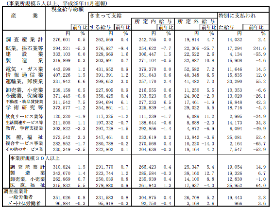 <資料2:月間現金給与額(平成25年11月速報分)>