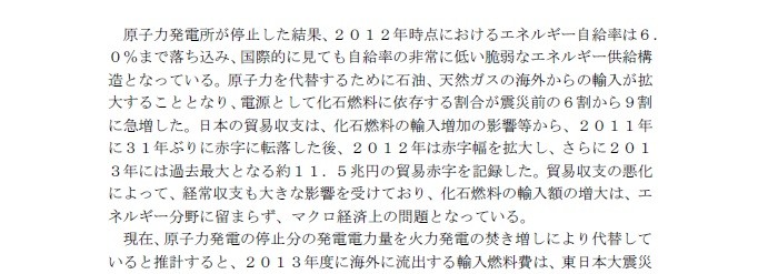 即ち、「現在、原子力発電の停止分の発電電力量を火力発電の焚き増しにより代替していると推計すると、2013年度に海外に流出する輸入燃料費は、東日本大震災前並(2008年度~2010年度の平均)にベースロード電源として原子力を利用した場合と比べ、約3.6兆円増加すると試算される」と。