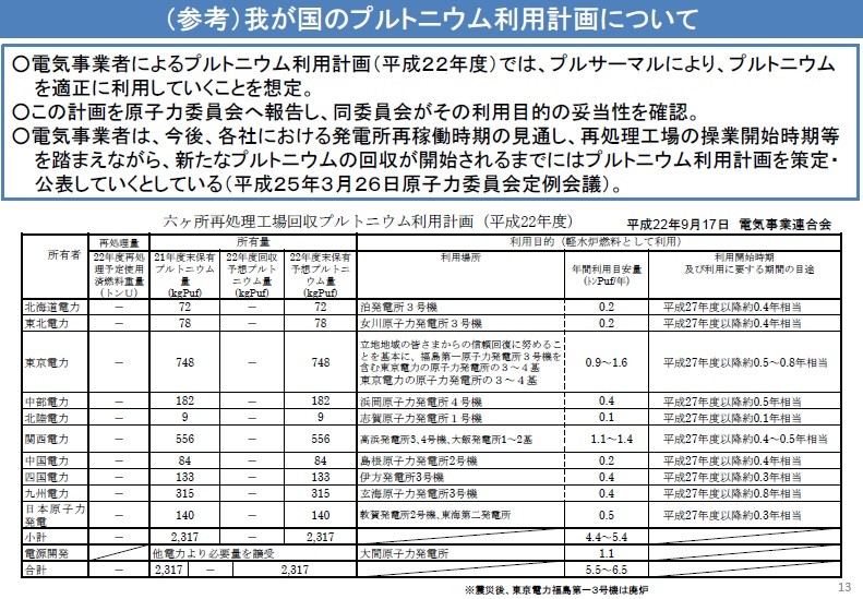 世界的に見ると、核燃料サイクルを推進しているのは日本以外にはイギリス・フランス・ロシア・中国など(資料1)。日本は今、六ヶ所再処理工場が原子力規制委員会の審査プロセスに入っている。日本の原子力発電事業におけるプルトニウム利用に関する方針・計画(資料2・資料3)は、東日本大震災以前に構想されたものであるため、今後修正を要するはずだ。