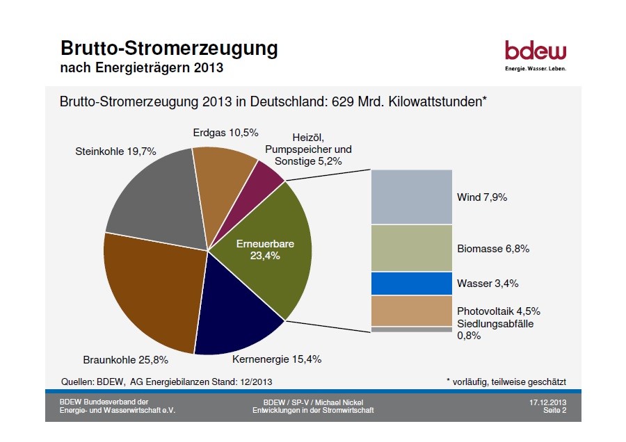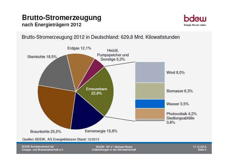 BDEW(ドイツ連邦エネルギー・水道連合会)の資料によると、直近2013年と2012年の電源構成は下に貼付した図表の通り。