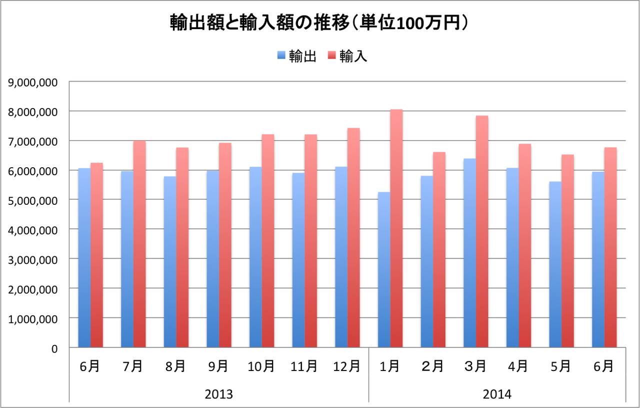 日本の貿易赤字がとまりません。原因はいろいろあると思います。円安で輸入額が膨れ上がった、とくに原発の停止で原油やLNGの輸入が増加したこともあるのでしょうが、それよりも深刻なのは円安効果で輸出が伸びると言われていたのが、現実は伸びないどころか、むしろ減少してきたことでしょう。円安になれば輸出が増えるというアベノミクスの大誤算です。