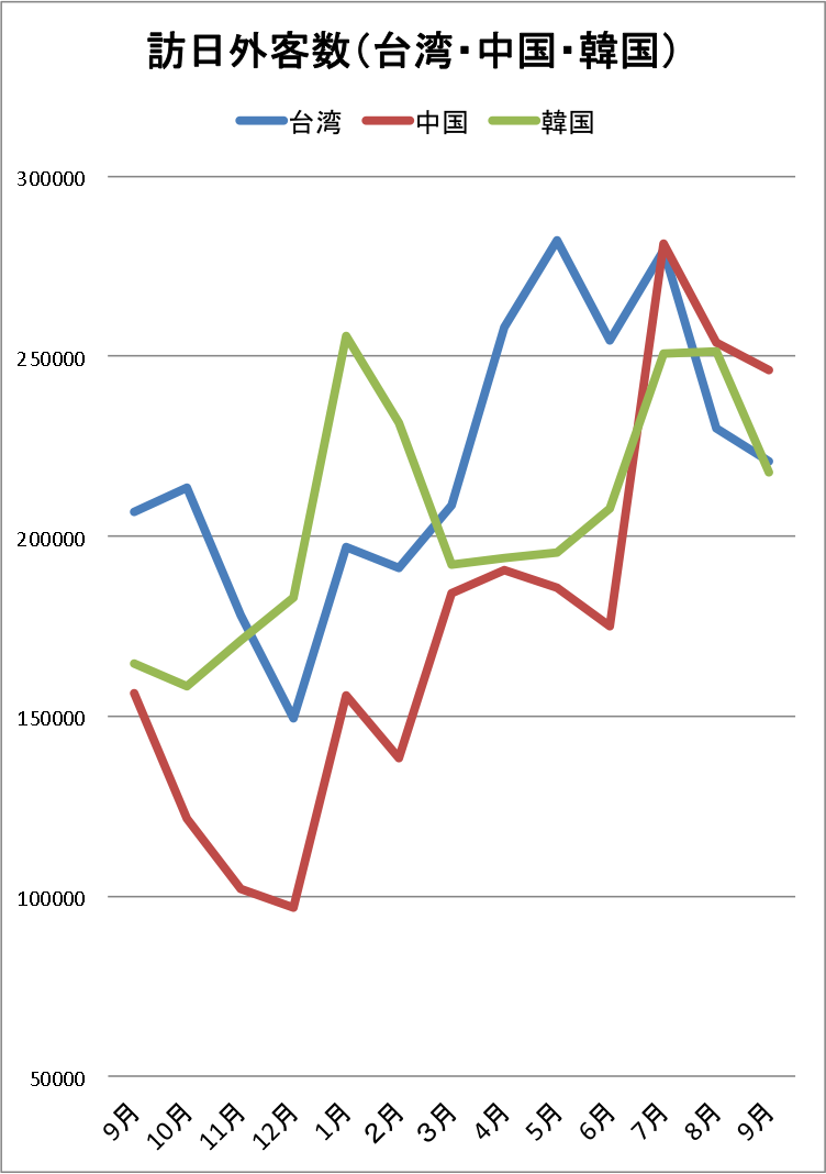 もう1点は、竹島問題、また歴史問題などで国民感情が互いに反発しているはずの韓国からの旅行者が、7月以降、3ヶ月連続で前年を超えてきていることです。しかも9月には、前年から32.3%も伸びてきているのです。