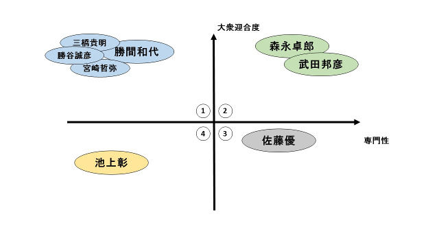 まず、現在、テレビや新聞と言った大手メディアの舞台でコメンテーターやら何やらとして活躍しているメジャークラスの方々を分類してみましょう。専門性と大衆迎合度という軸を設定すると、彼らは大きく分けて4種類に分類できます。ここでいう専門性とは、経済系の出版社から単著を出したり専門誌に寄稿するくらいのニーズがある人、大衆迎合度というのはポピュリスト的言説のようなものです。