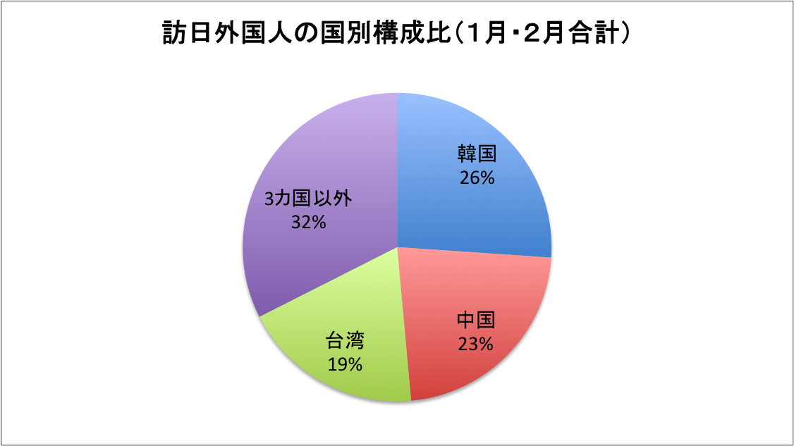 外交関係がうまくいっているとはいえない韓国、中国からの旅行客が増加し、この1月と2月の合計では、両国からの訪日旅行客でなんと全体の49%を占めるにいたっています。