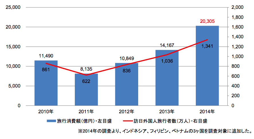 旅行消費額と訪日外国人旅行者数の推移(訪日外国人消費動向調査より)