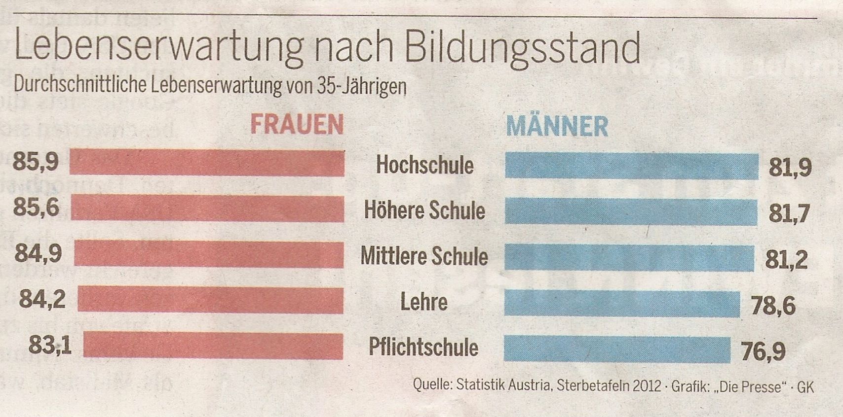 オーストリア統計局のデータをもとにプレッセ紙が報じたところによると、大卒の国民の平均寿命は男性で81・9歳、女性で85・9歳。一方、中学校卒業者の場合、男性が76・9歳、女性83・1歳だった。男性で大卒者と中卒者の間で5歳の差がある。女性の場合、その差は2・8歳だ。いずれにしても、男女とも教育水準の差で平均寿命が異なることが判明したのだ。