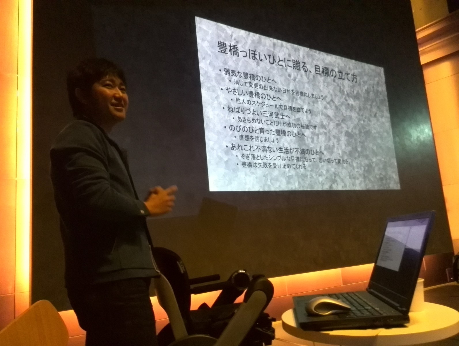 このマシーンに乗っているのが、開発者であり共同創業者(現・最高開発責任者)でもある内藤淳平さん。 この動画は、今年2015年1月に豊橋で講演をされたときのもの。