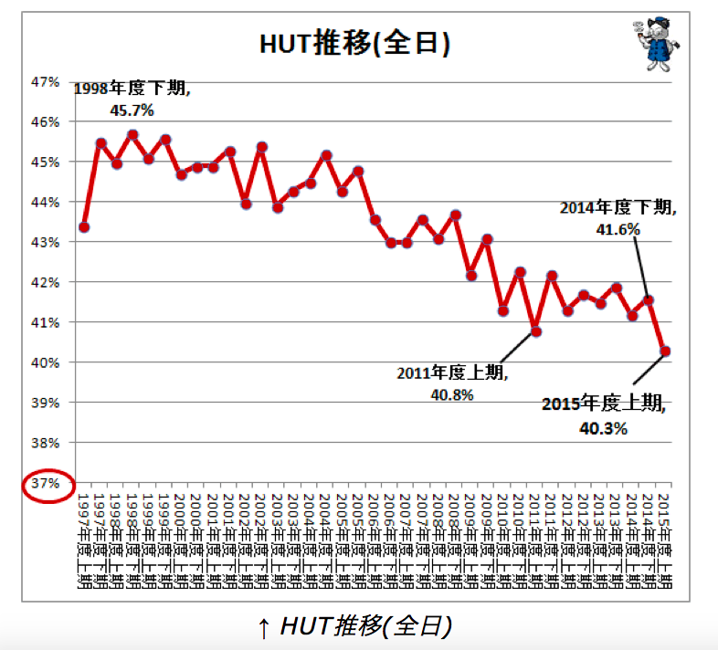 第一は視聴時間の競合です。それでなくともテレビをつけている世帯の比率(HUT:総世帯視聴率)は下がってきています。その減ってきた時間すら動画ストリーミング・サービスが侵食しはじめるのです。