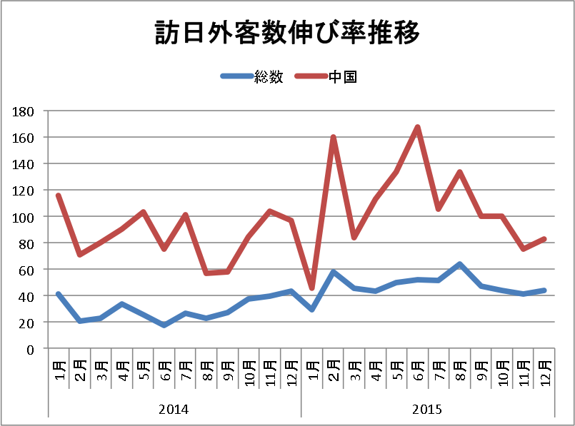 グラフは、訪日観光客数の伸び率の推移ですが、倍々ゲームさながらです。