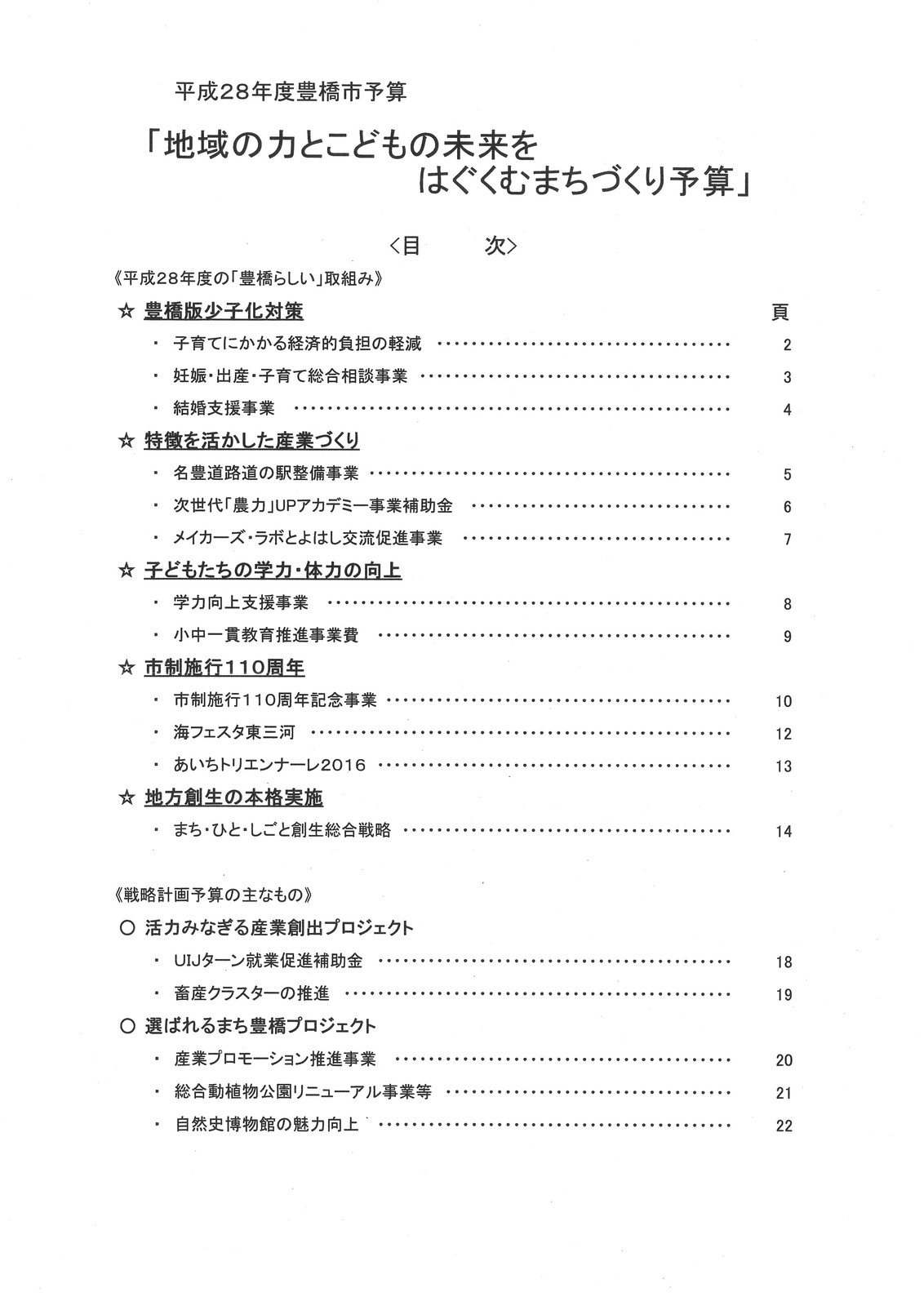 そんなわけで、目次でも、「豊橋版少子化対策」が一番上に記載あります。 そして、一番はじめのページにあるのがこちら。