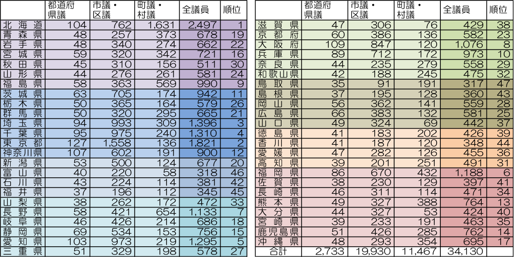最も議員数が多かったのは、東京ではなく北海道で2,497人だった。次いで東京の1,821人、3位が埼玉で1,396人、4位が千葉で1,310人、5位が愛知県の1,295人と続いた。以外にも神奈川県が900人で12位だった背景には、政令市が3つもあり自治体数が少ないことなどが影響しているのではないかと思われる。ちなみに最も議員数が少ないのは鳥取県で317人だった。