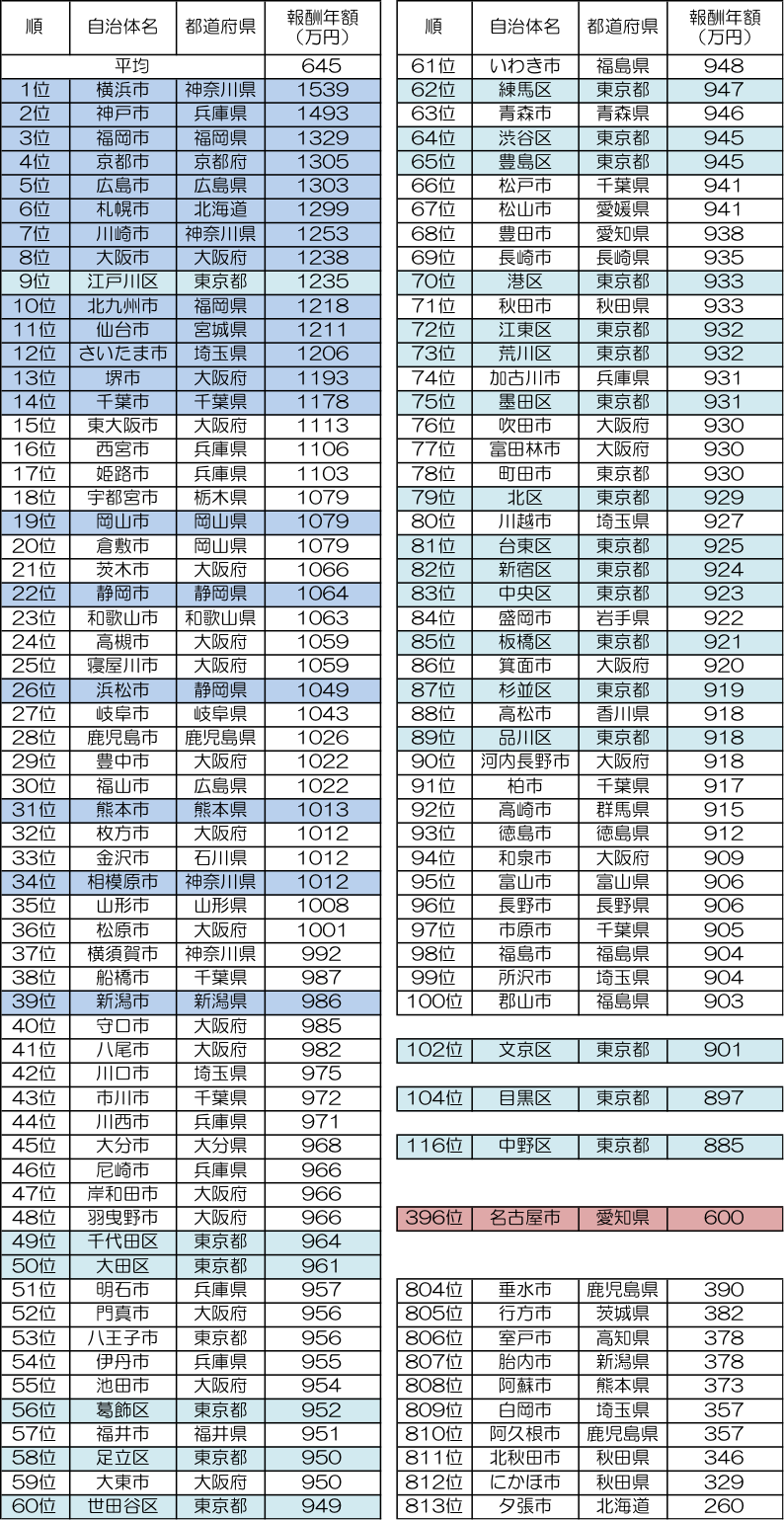 最も報酬が多かったのが、横浜市(神奈川県)で1,539万円だった。次いで、神戸市(兵庫県)が1,493万円、3位が福岡市(福岡県)で1,329万円、4位が京都市(京都府)1,305万円、5位が広島市(広島県)で1,303万円と並んだ。23区の中でトップが9位の江戸川区(東京都)1,235万円だったというのも驚いたが、14位の千葉市(千葉県)1,178万円までに入った自治体は、すべて政令市と23区だった。