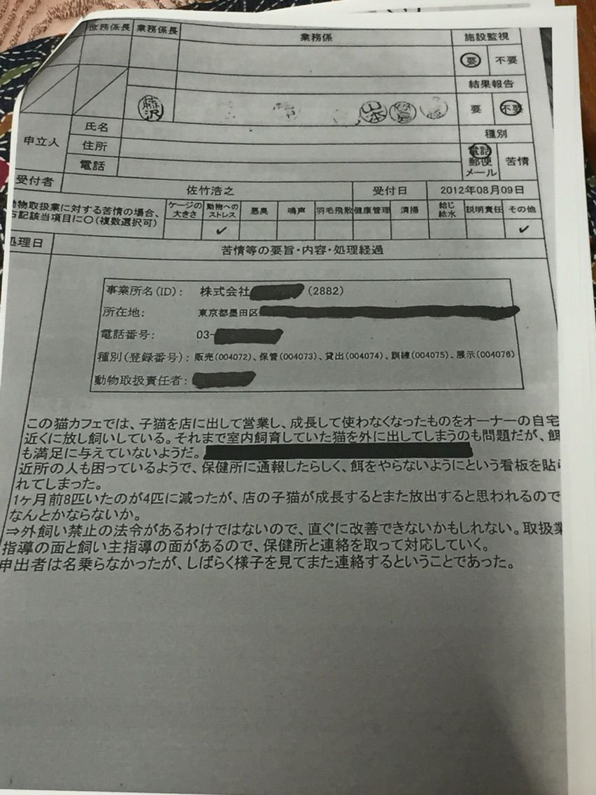 2012年7月から8月にかけては、成長して販売ができなくなった去勢していない猫達を経営者の自宅付近で放し飼いをして、地域の猫と交配をしてしまう、糞尿の匂いがひどい…等々近隣住民から再三再四にわたる苦情が寄せられるという、取扱事業者にあるまじき驚愕の状況でした。