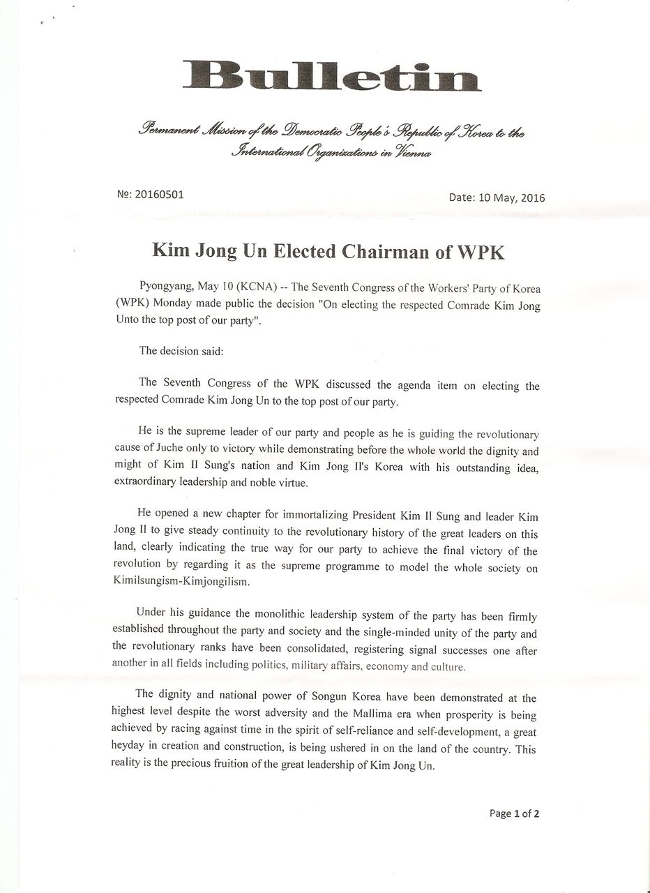 記事のタイトルは「Kim Jong Un Elected Chairman of WPK」(金正恩氏を朝鮮労働党委員長に)だ。「第7回朝鮮労働党大会は尊敬すべき指導者金正恩氏をわが党の最高位に選んだ決定を公布した」という書き出しで始まる。