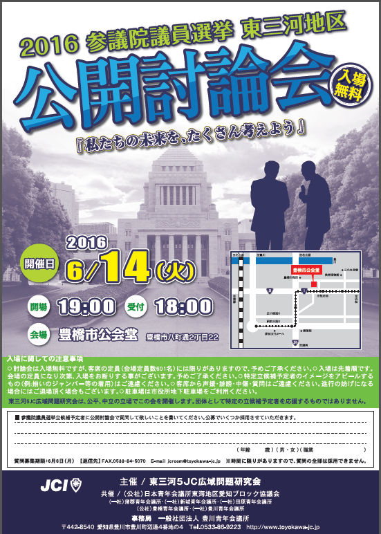 本日、2016年6月14日(火)19時より、豊橋市公会堂で愛知県での立候補予定者による討論会があります。