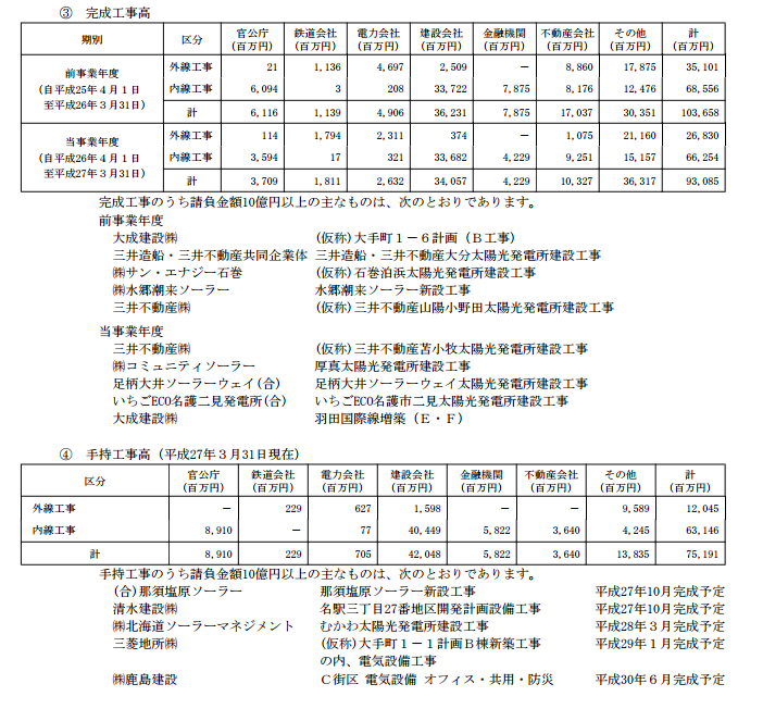 それは同社の有価証券報告書を見れば明らかな話で、業績回復期(平成25年度〜平成26年度)の大口の工事のほとんどメガソーラーがらみのものだ。平成27年度の見込み案件にようやく三菱地所と鹿島建設の下請けらしき案件が出てきている。これがオリンピック絡みなのかどうかわからないが、おそらく関係ない。