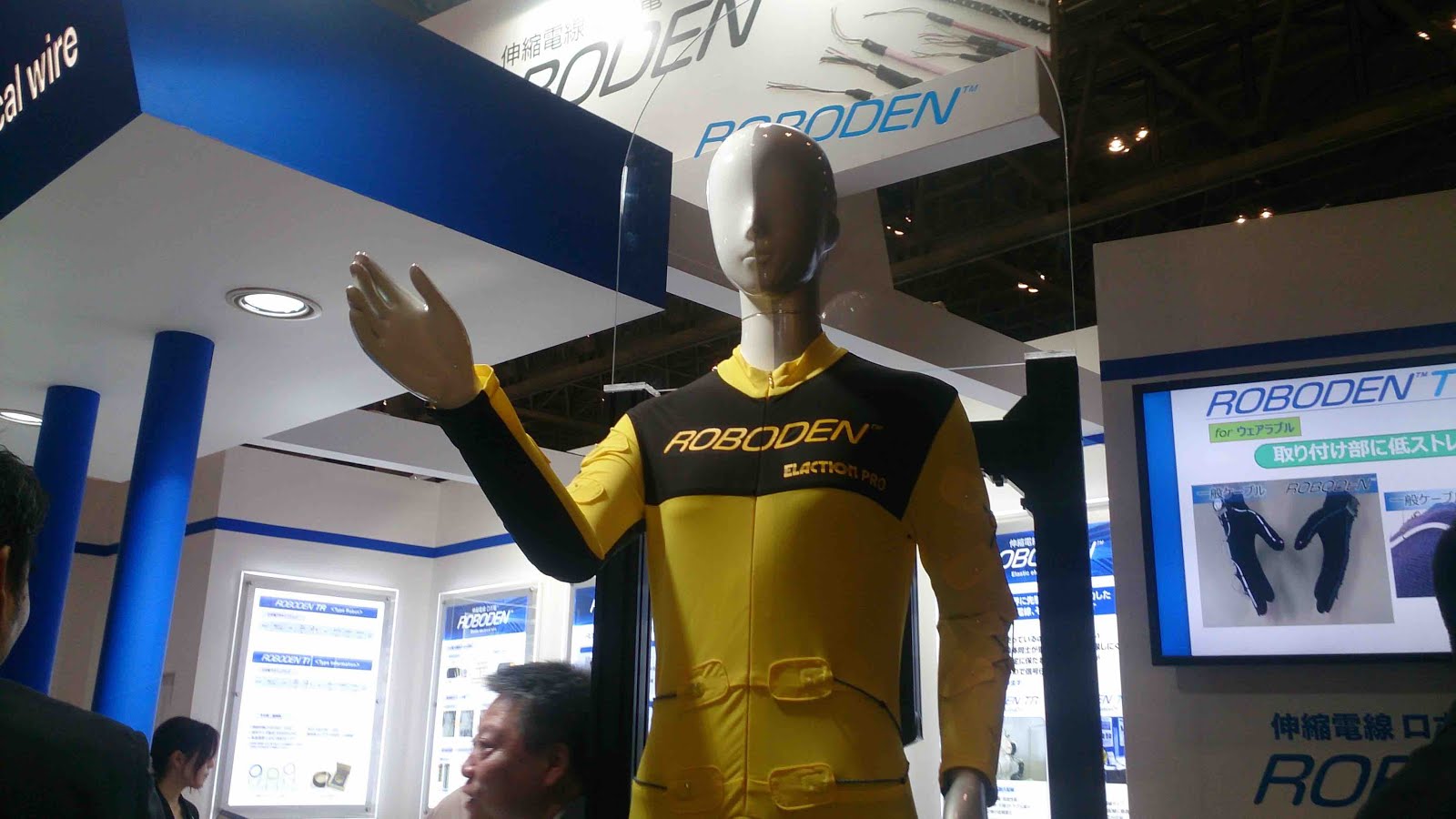 旭化成のようなIT外の企業が参加しているのが魅力。次世代衣料「スマートウエア」で売り込みを図るといいます。電線として使える伸縮素材「ロボ電」は、ゴムのように伸び縮みするため、衣服の生地に縫い込んで生体情報などを送るといいます。