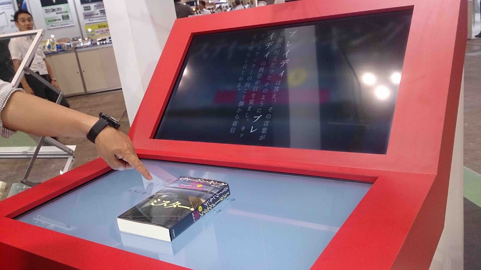 楽天はネット情報と店舗や消費者の生活をつなぐ展示。タッチパネルに本を置くと、登場人物や地名などを表示。カメラで表紙を識別し、ネット上から情報を取得する仕組みも。本以外にも、置いた食材を使ったレシピや商品のレビューなども紹介できる。