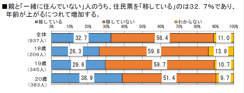 総務省が昨年12月に公開した調査によると18歳~20歳のうち親と一緒に住んでいないにもかかわらず、住民票を移していない人は6割近いということである。