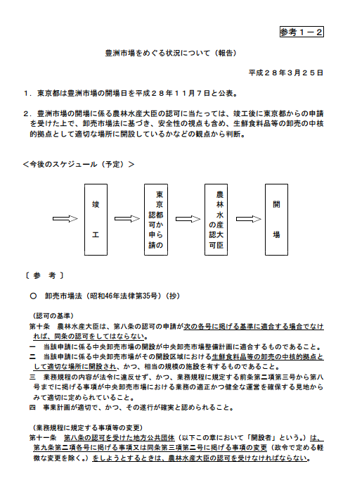 〜東京都は、舛添前知事が豊洲市場の開場日を平成28年11月7日と平成27年7月11日に公表しておられましたが、小池都知事が平成28年3月31日に開場の延期を発表されているという状況でございます。
