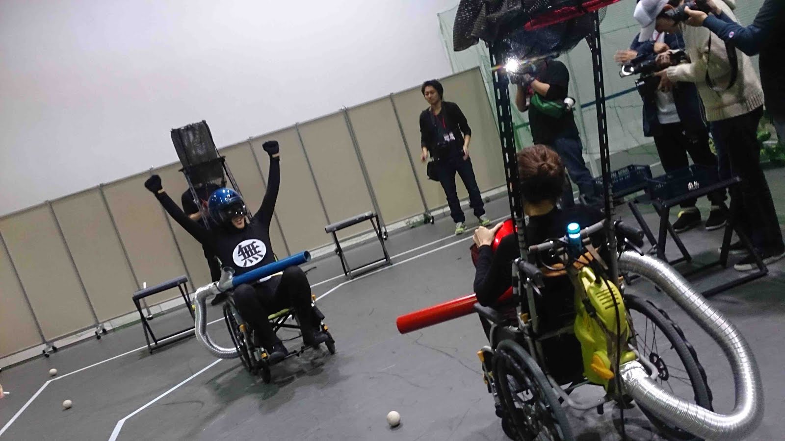 車イスのひとはボールを投げるのが難しい、ということを踏まえたマジメなスポーツなのだが、ユルさが笑いを誘います。