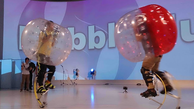 ばねでできた西洋竹馬を足につけてジャンプ力を強化し、弾力性のある透明な球体を上半身に被って、ぶつかり合う超人相撲。