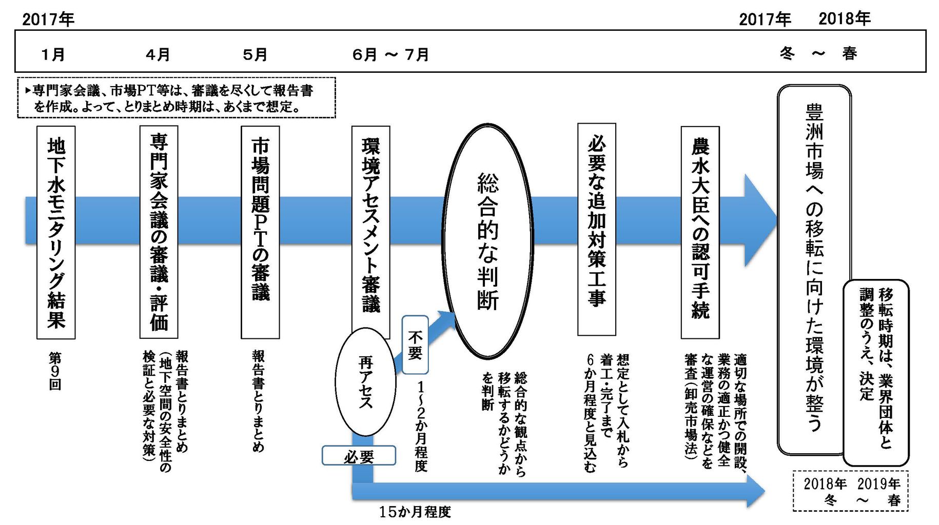 ここでまず参照すべきは、小池知事が示した豊洲市場移転に向けてのロードマップです。現在は市場問題PTでの審議が行われているわけですが、予定では、