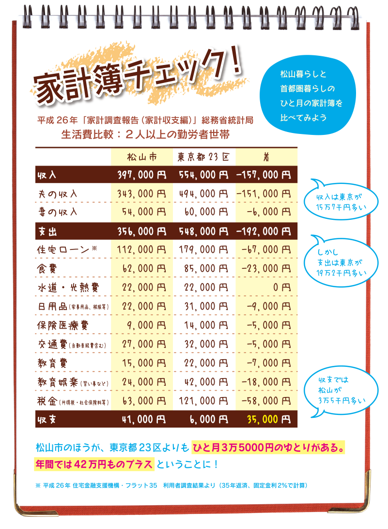 松山の平均収入は東京より少ないが、家賃や食費などの支出が少なく、逆にひと月35,000円のゆとりがあるというもの。