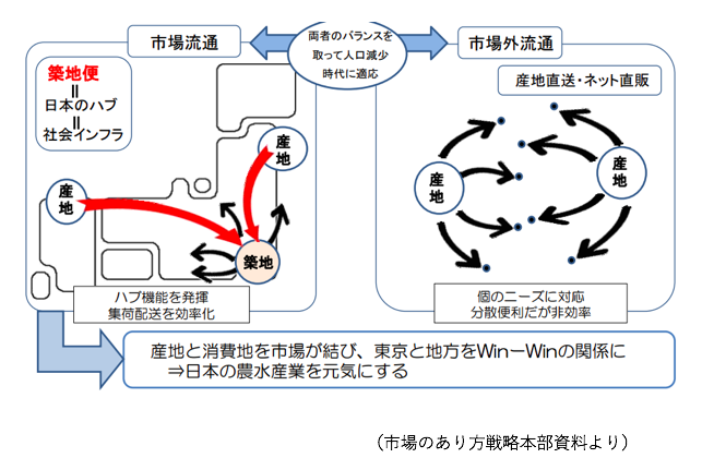 まず現状なのですが卸売市場法改正については農業競争力強化プログラムにおいて政府の方針として「抜本的見直し」が決まっており、現在未来投資会議や規制改革推進会議や自民党の農林水産部会で具体的に何をするかということについて議論がなされているのですが、農水省も自民党議員も何をしていいかわからず、業界も降って湧いたような話に困惑して、あらゆる方面において迷走中という状況にあります。