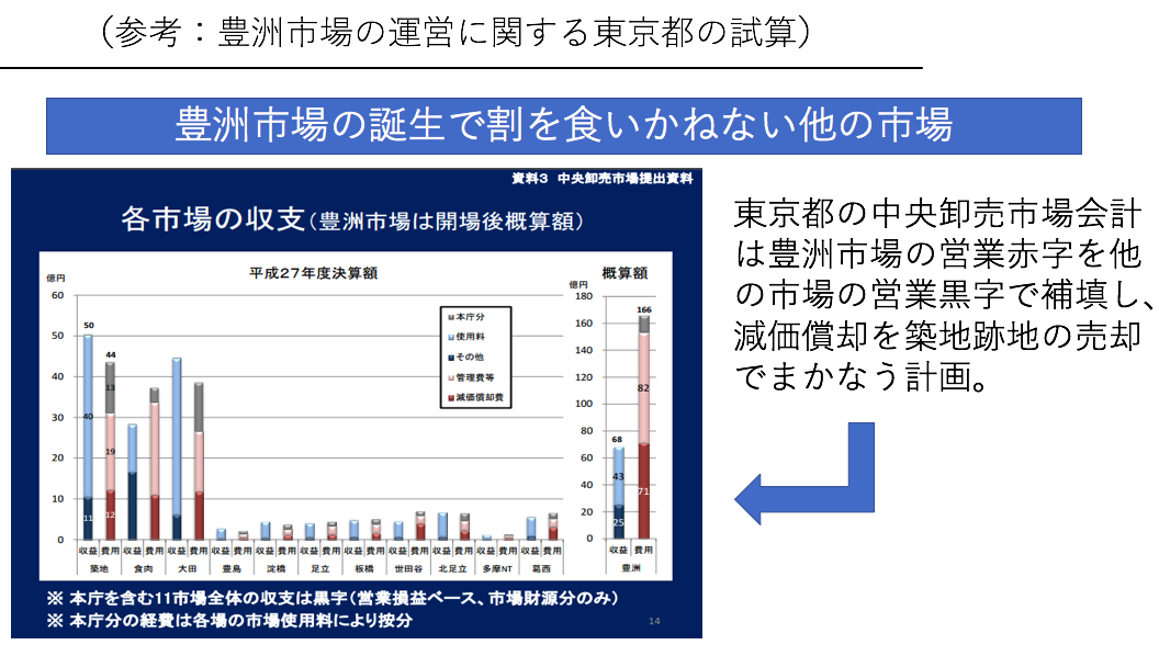 一般に中央卸売市場の会計というのはどんぶり勘定になっており、東京都においても、豊洲市場の恒常的な赤字を他の市場の黒字と築地跡地の売却益で補填する計画になっています。これでは遠からず他の市場の関係者が「なぜ俺たちの場所代が他市場の、しかも最先端設備を持つ市場の赤字補填に使われなきゃいけないんだ」と不満を持つようになると見込まれ、他の市場の関係者が黒字化の努力を怠るようになりかねませんし、また最後は税金が補填してくれるとなるとなおさら規律が弱くなってしまうのも当然です。