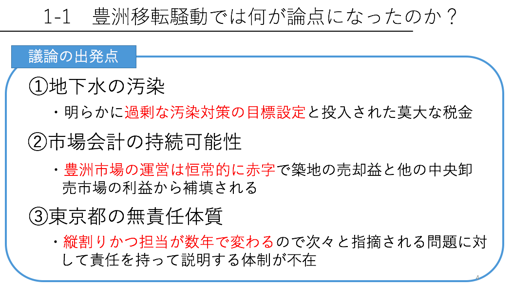 ここまでの騒動の経緯の詳細についてここでまた語る気はないのですが、あらためて振り返ると豊洲移転騒動で論点になったことは【①地下水の汚染、②市場会計の持続可能性、③東京都の無責任体質】の三つだったと思います。これらは全て連動しており