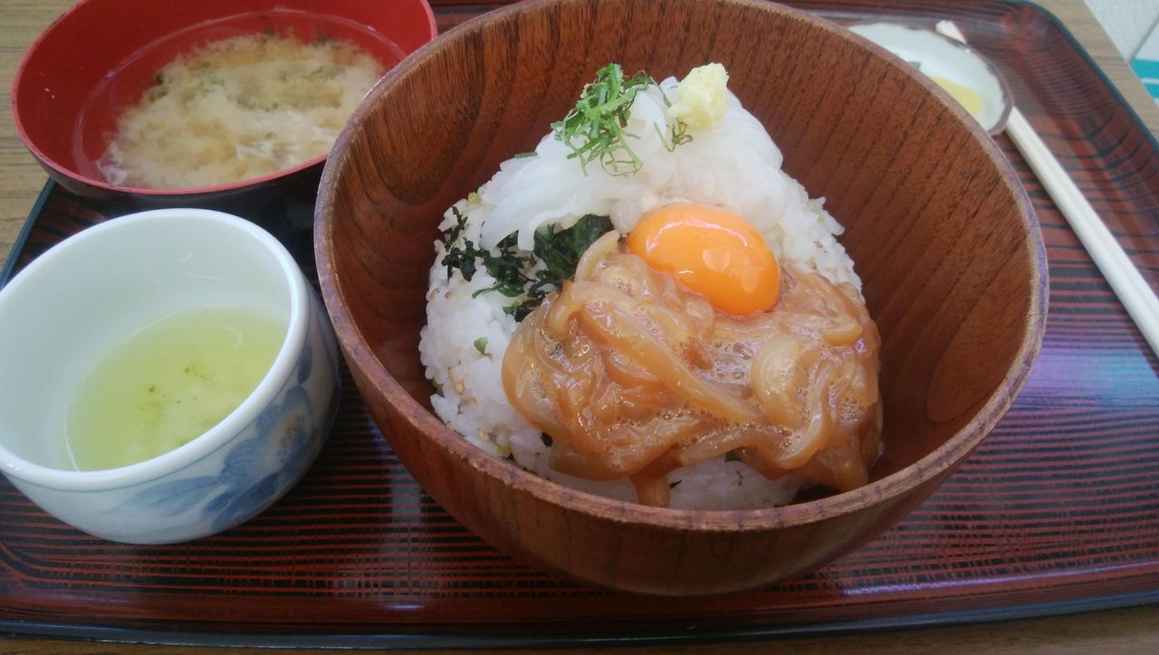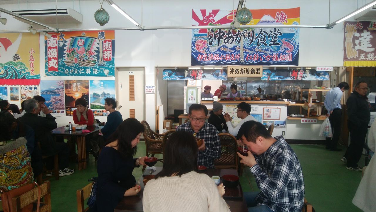 伊豆漁協が運営する「沖あがり食堂」の名物は、「いかサマ丼」。どんなインチキされるのかな?と思ったのですが、刺身と酢漬けのイカ、そして夕日に見立てた卵黄。良心的な値段で、とても美味しかったです。