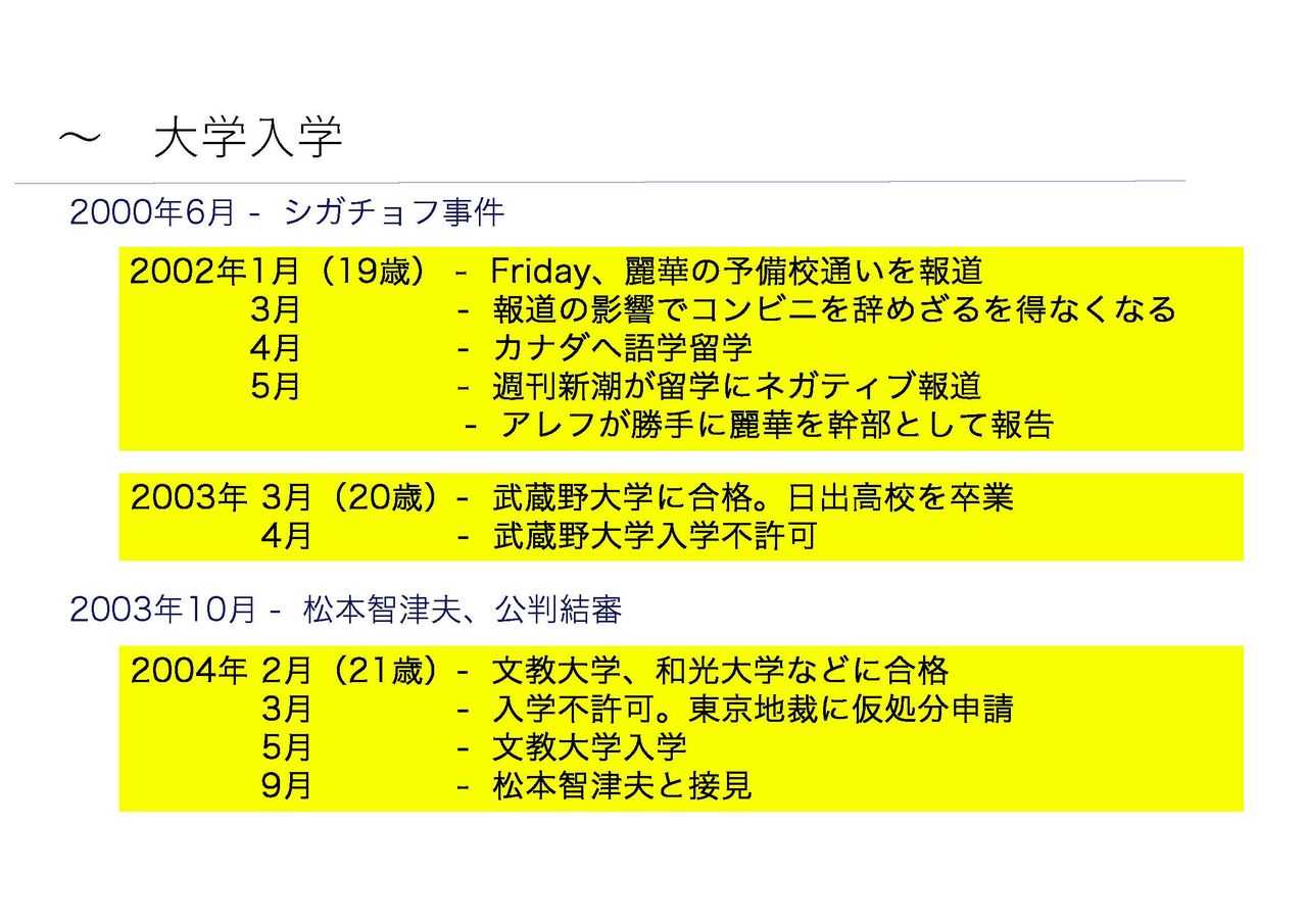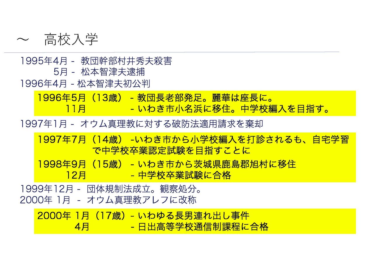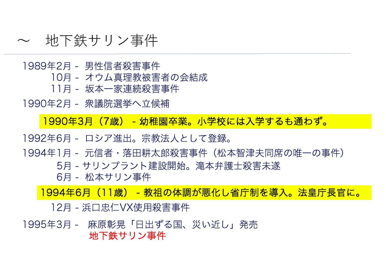 事実をおさえつつ、麗華氏の主張を伝える」というものであった。その意味で、中立的であったか、というとそもそも麗華氏の主張を伝えるためのイベントだったので、そうではなかったと言える。ただ事実を踏まえたイベントになるように、オウム事件関連の年表を作成して、会場で共有した。以下本日私が使用した年表資料を添付しておく(青文字がオウム関連の歴史、黄色で塗りつぶしているのが松本麗華氏関連の経歴)。