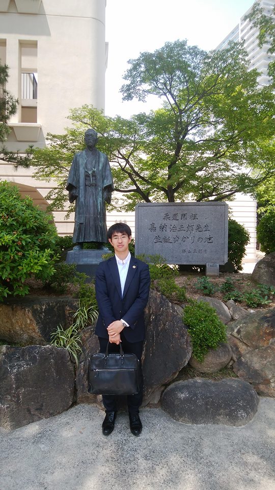 (灘校正面玄関。嘉納治五郎先生の銅像の前で。)