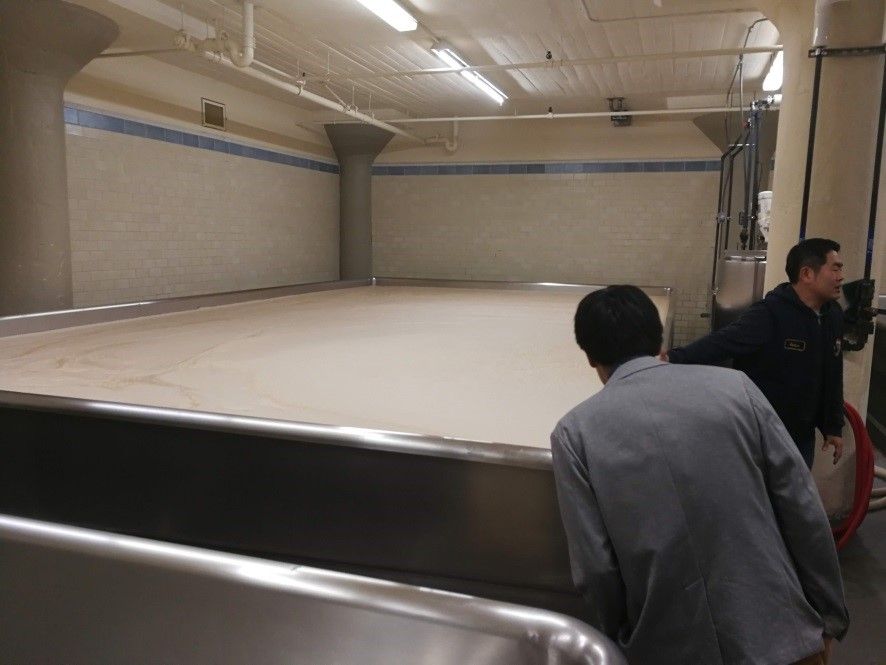 次に麦汁を酵母によって発酵させますが、アンカー社ではまるで「プール」のような容器のタンクを用いて、直に空気に触れることで発酵させています。壁面や空気中の酵母がこのプールに入ることで、いわば「秘伝のタレ」のようにアンカーの基礎となる味を形成しており、このプールが壊れると今のアンカーの味は作れなくなってしまいます。これまで何気なく飲んでいたアンカーの味の源泉を発見した気分で、思わず見入ってしまいました。この一次発酵のプロセスは、3日間ほどかけて行います。