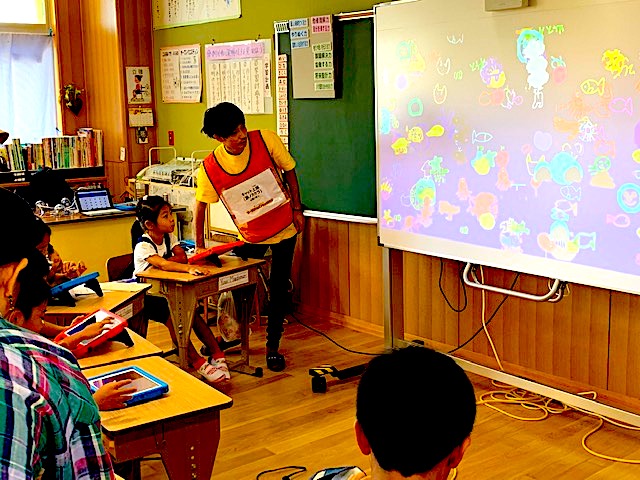 描いた絵をプログラミングで自由に動かすことができる言語「Viscuit」をつかって、自分で描いた海の生き物を泳がせる。