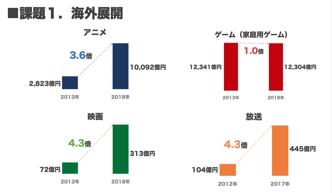 まず、海外展開。2013年にクールジャパン機構が設置されるなど資金面での政策ツールは充実した。海外売上は5年で26%拡大。アニメは3.6倍、映画は4.3倍。放送は4.3倍。政策の成果と言ってよい。ただし日本の売上は海外市場全体の2.5%で、伸びしろが見込まれる。