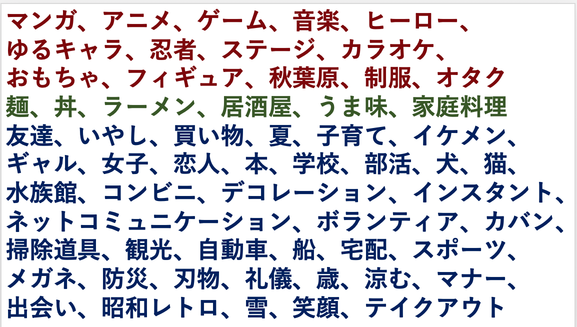 当初はアニメ・ゲームなどポップカルチャーものが多かったが、ジャンルが広がっている。食では丼、ラーメンなど。その他にも、友だち、買い物、本、部活、水族館、コンビニ、宅配、マナーなどなど。直近のテーマはテイクアウト。コロナで弁当文化が土台になって新文化が生まれている、という番組。