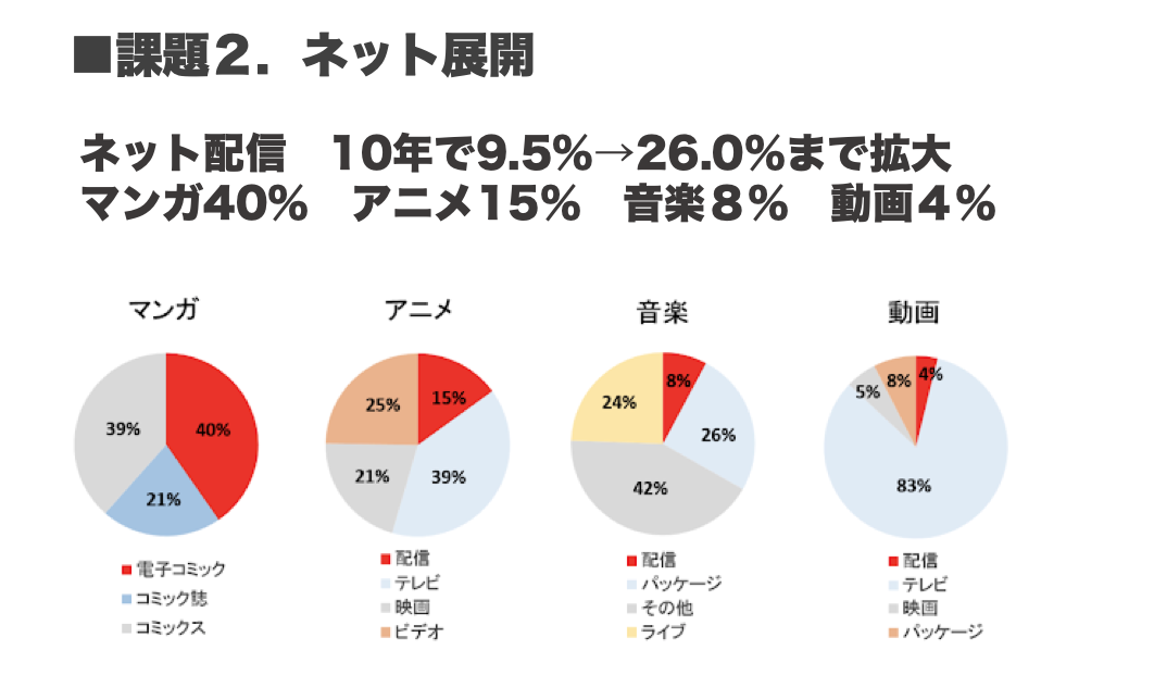 次に、ネット展開。配信は2008年の9.5%から26.0%まで拡大したが、マンガ40%、アニメ15%、音楽8%、動画4%と 分野により差が大きい。出版は昨年、23年ぶりに売上が増加。電子出版の版権ビジネスが伸びた。一方、音楽は世界市場がネットで成長した波に乗れていない。