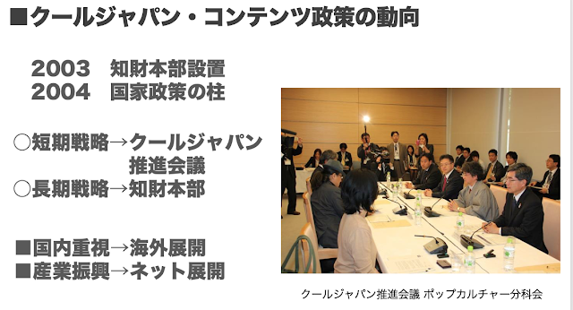 2003年には知財戦略本部を置き、経済産業省や文化庁など関係する省庁とともに、コンテンツなどの知財の政策に力を入れ始めた。かつての国内重視・産業振興策から、海外展開・ネット展開重視へと転換してきている。
