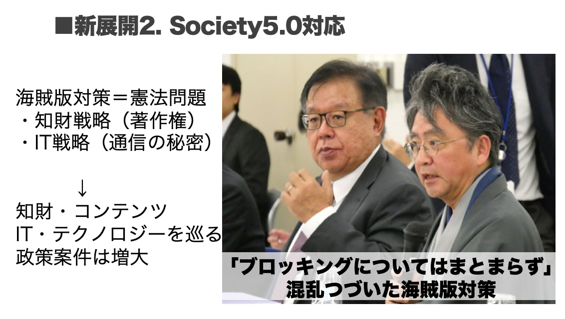 また、海賊版対策は知財戦略(著作権)とIT戦略(通信の秘密)との間の調整が重要課題。同様に、知財・コンテンツとIT・テクノロジーを巡る政策案件は増大すると予測される。デジタル庁が菅内閣の重要課題になっているが、クールジャパンに関する行政組織のあり方も検討すべき。