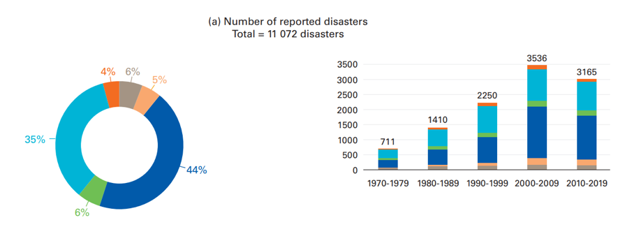 さてここで、この「報告の改善」という文言を覚えておこう。以下は、WMOの報告書で集計された気象・気候災害のグラフである。
