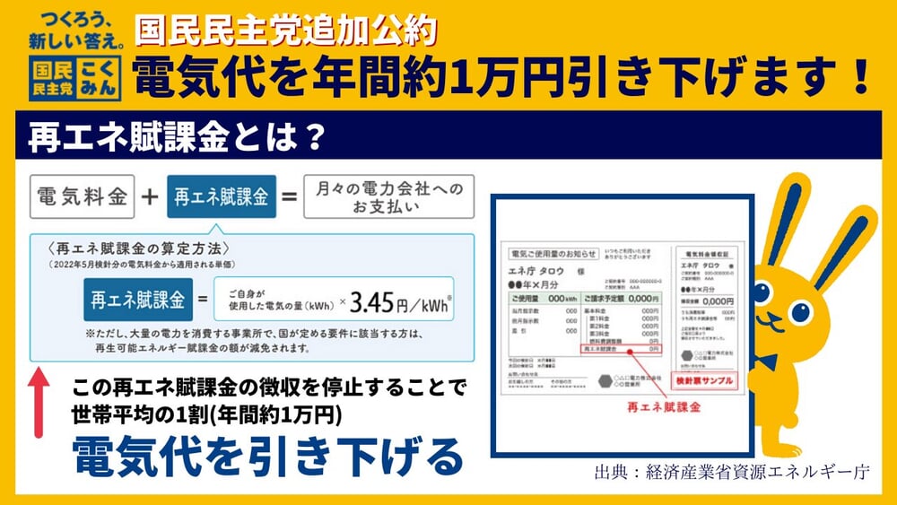 再エネ賦課金を「徴収停止」しようといっています。